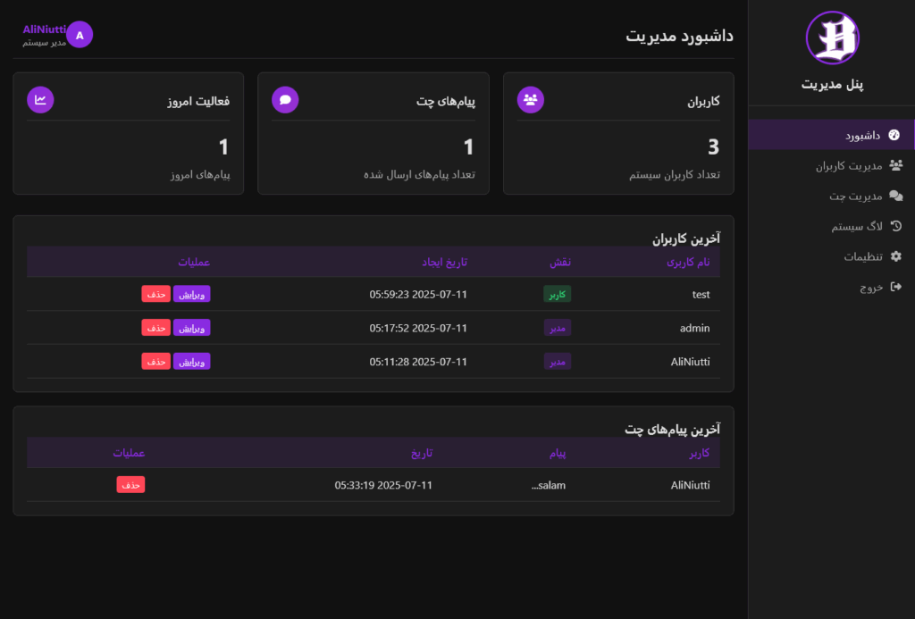 دارای سیستم ادمینی و چت دوستانه با دسترسی کامل